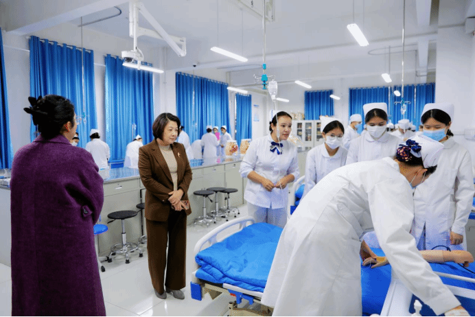 行走五大实训区域,田丽始终以临床专家与教育者的双重视角进行观察。她对各实训室紧贴临床实际、注重能力培养的建设思路给予积极评价,这充分体现了护理学院立足临床前沿、强化实践育人的办学理念。她特别指出,这些先进完备的实训条件,不仅为边疆地区培养高素质应用型护理人才奠定了坚实基础,更为提升区域医疗卫生服务能力提供了有力支撑。